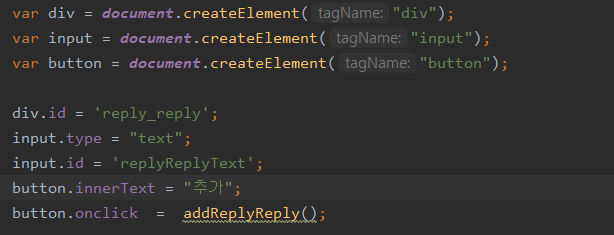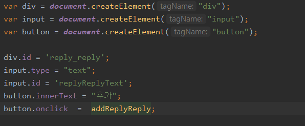 그리고 button을 동적으로 생성한뒤에 onClick 이벤트에 addReplyReply함수를 할당해주려고 하였다.