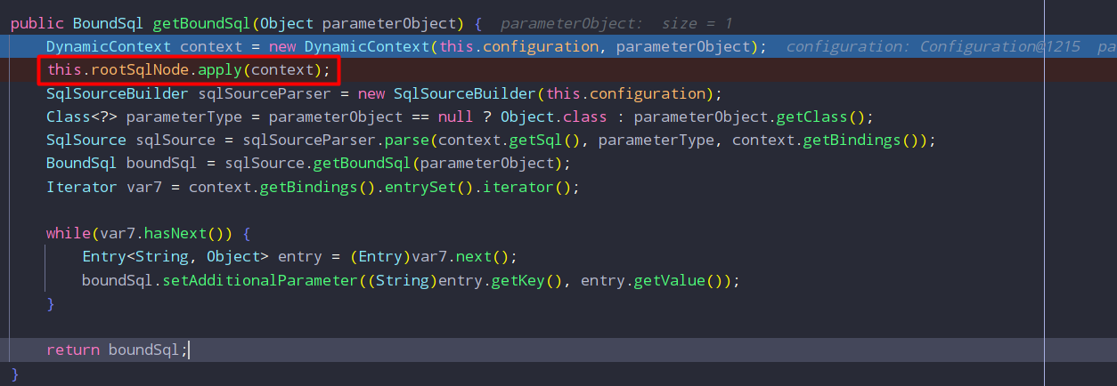 getBoundSql 메소드안에서 현재 등록되어있는 SqlSource의 getBoundSql 메소드를 실행합니다.