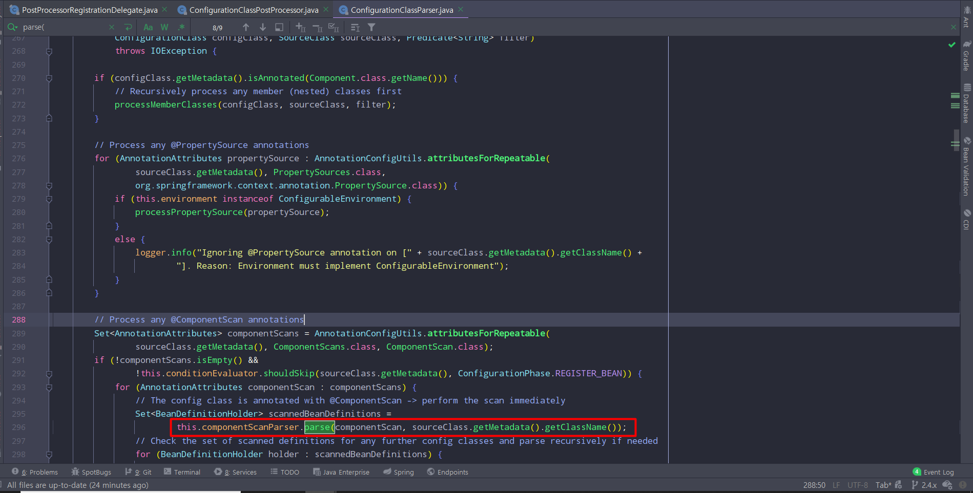 doProcessConfigurationClass 메소드에서 조금 내려보면 componentScanParser.parse가 보인다.