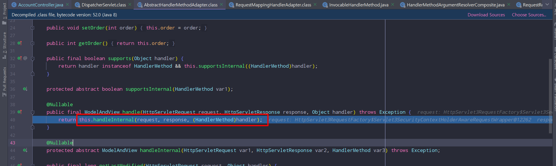 AbstractHandlerMethodAdapter에서는 handleInternal 메소드를 호출한다.
